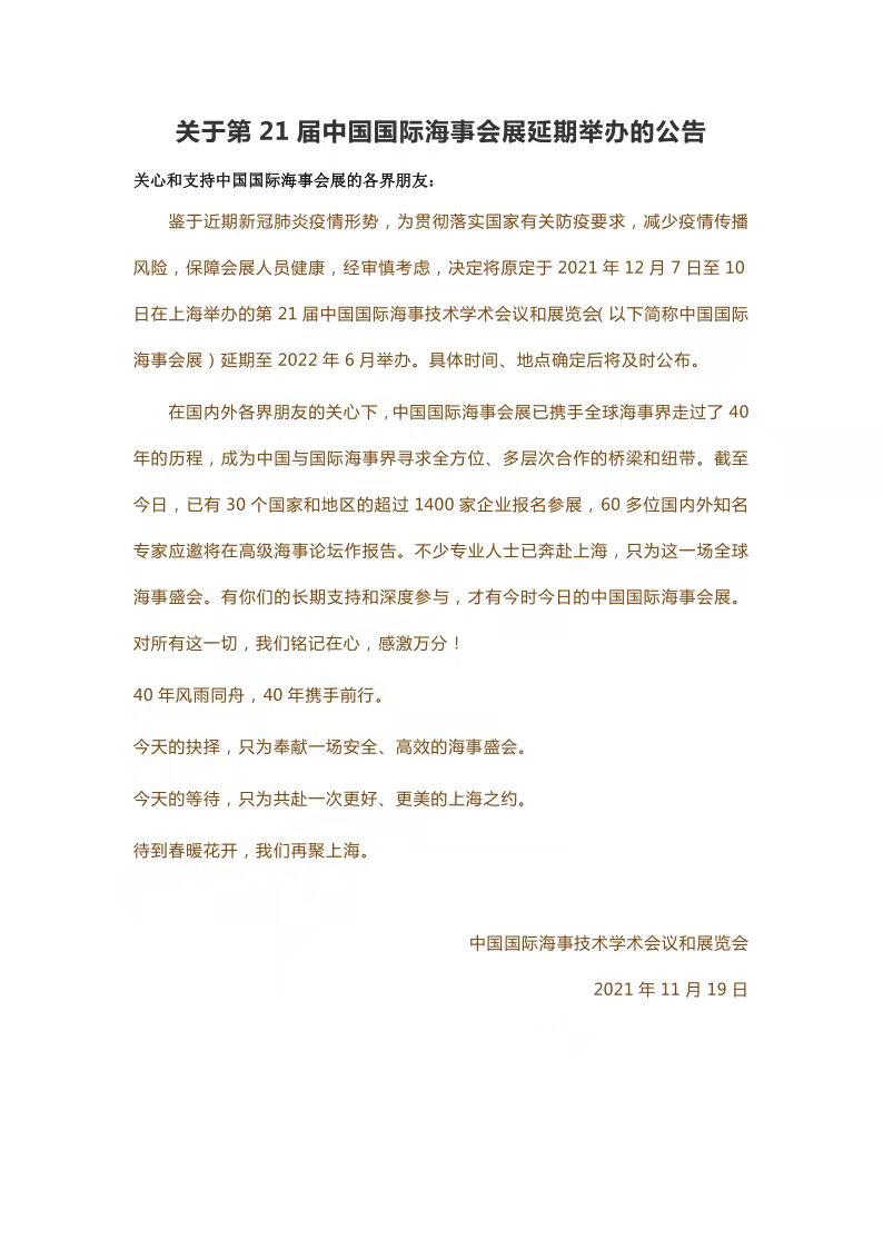 关于第21届中国国际海事会展延期举办的公告